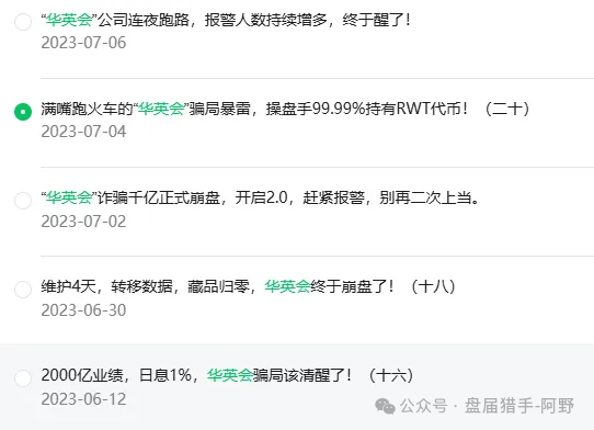 聚币的操作模式,让人不禁联想到之前的“华英会”骗局。“华英会”骗局暴雷,操盘手99.99%持有RWT代币,而在相关聊天记录中,“平头哥社区委员会会长”多次推荐RWT,称“rwt,这个在avi能买”“rwt,我买了”,试图引导更多人入局。如今“华英会”公司连夜跑路,报警人数持续增多,历史总是惊人的相似。