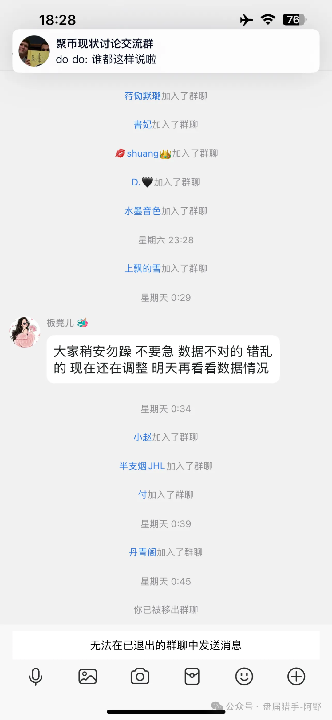 从聊天记录里能看到,在聚币相关交流群中,当用户发现数据不对、币价混乱时,管理员“板凳儿”只是安抚大家“稍安勿躁,数据不对的、错乱的,现在还在调整,明天再看看数据情况”,可最终等来的却是JU币的雪崩。很多投资者把大量资金投入聚币,甚至幻想着跟着平台上市大赚一笔,结果却被现实狠狠教训。