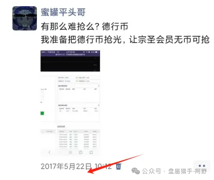 再往前看,2017年“宗圣文化”以传递曾子“德行天下,孝耀中华”的理念为名义,利用互联网进行诈骗活动,54名湖南永顺县受害人员被骗金额合计达1889450元,后续“宗圣文化”部分会员到湖南八里香公司讨要说法并报案,最终湖南警方破获八里香宗圣文化非吸案,曾繁荣落网其兄妹均投案自首。而在关于“德行币”的聊天中,“蜜罐平头哥”称“有那么难抢么?德行币,我准备把德行币抢光,让宗圣会员无币可抢”,还表示“每天百分十涨幅,目前还是死很难抢购,现在割肉出手,价高者得”,其炒作、收割的套路,和“宗圣文化”以及如今聚币如出一辙。