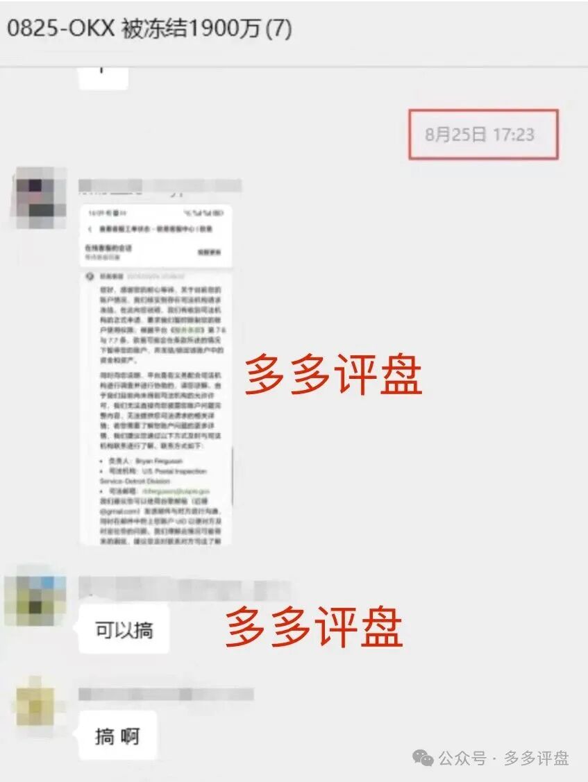 8月24日,一名OKX大户遭遇了一场“无妄之灾”:账户突然被冻结,资产瞬间沦为数字囚笼中的困兽。联系客服后,得到的却是一纸冰冷回复——因“司法机构请求”而限制操作,依据是平台《服务条款》第7.6与7.7条中那句近乎“霸王条款”的声明:“配合司法执行,概不担责”。 更魔幻的是,客服竟轻描淡写地甩出一个美国邮政检查局(U.S. Postal Inspection Service)的联系方式,并“贴心”建议用户通过Gmail邮箱自行与对方沟通。仿佛在说:“您的资产?您的麻烦,请自带干粮解决。”