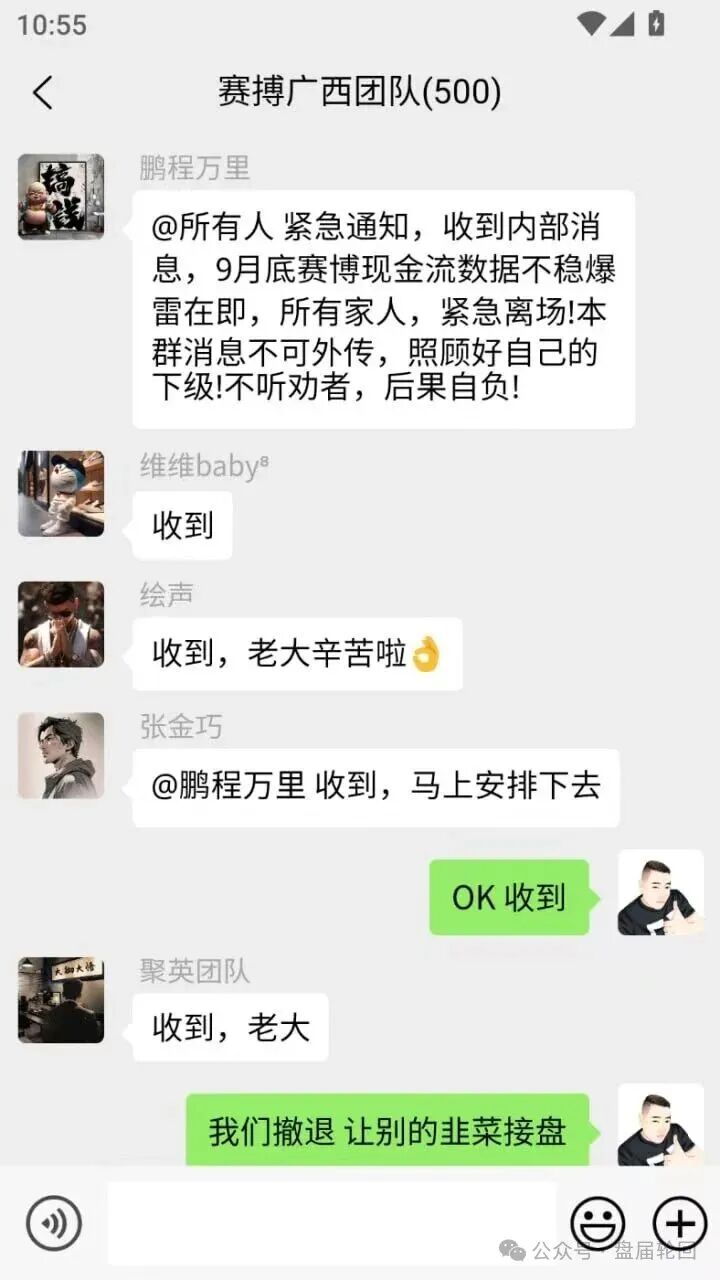 今天轮回得到可靠消息 现在湖北 成都 广西几个大团队已经开始在私下撤离 。毕竟赛博也活了这么久 泡沫增长太大 马上承受不了会员提现的压力 。距离全线崩盘锁仓也就不远了 。