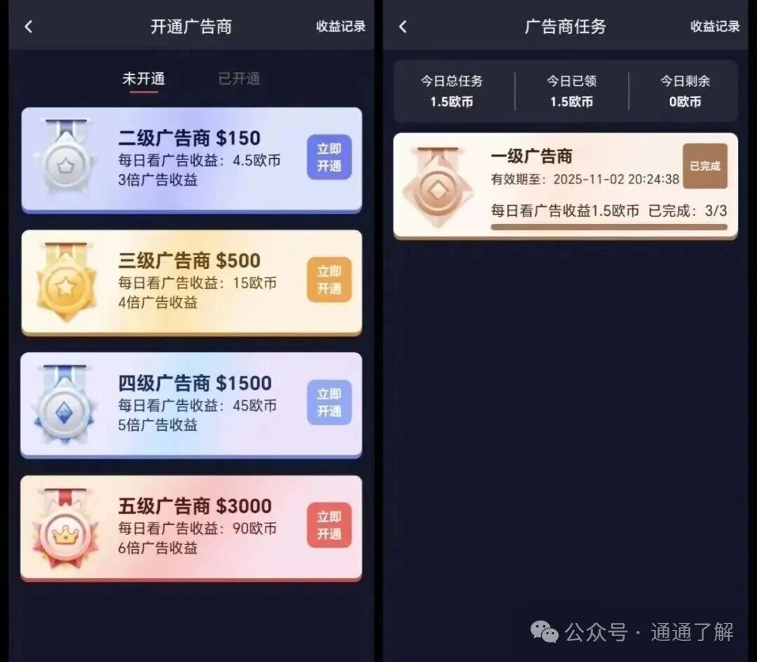 平台推出了从50U到3000U不等的星级广告商制度,公然承诺靠投广告33天就能回本。这种违背市场规律的回报率本应引起警惕,却成了吸引贪婪者的金光大道。
