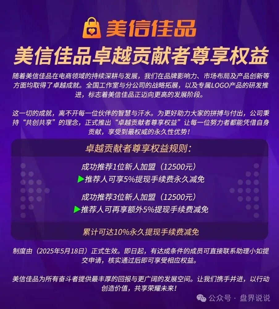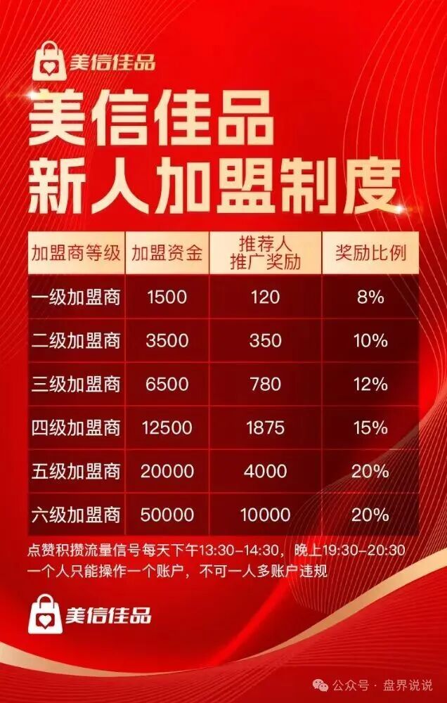 这是“美信佳品”的模式制度,设置6500元、12500元、20000元三个投资门槛,日收益高达1.6%。拉人头加盟投12500元可享5%-10%收益,永久提现手续费减免的拉新规则,并宣称随时提现无限制。