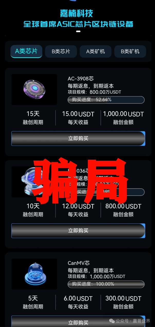 震哥最近收到粉丝咨询,问这个新冒出来的“嘉楠科技”资金盘能不能投。一看就知道是典型的短命盘,打着芯片和矿机的旗号,实际上就是个坑。这盘子分芯片和矿机两类产品,日收益1%以上,年...
