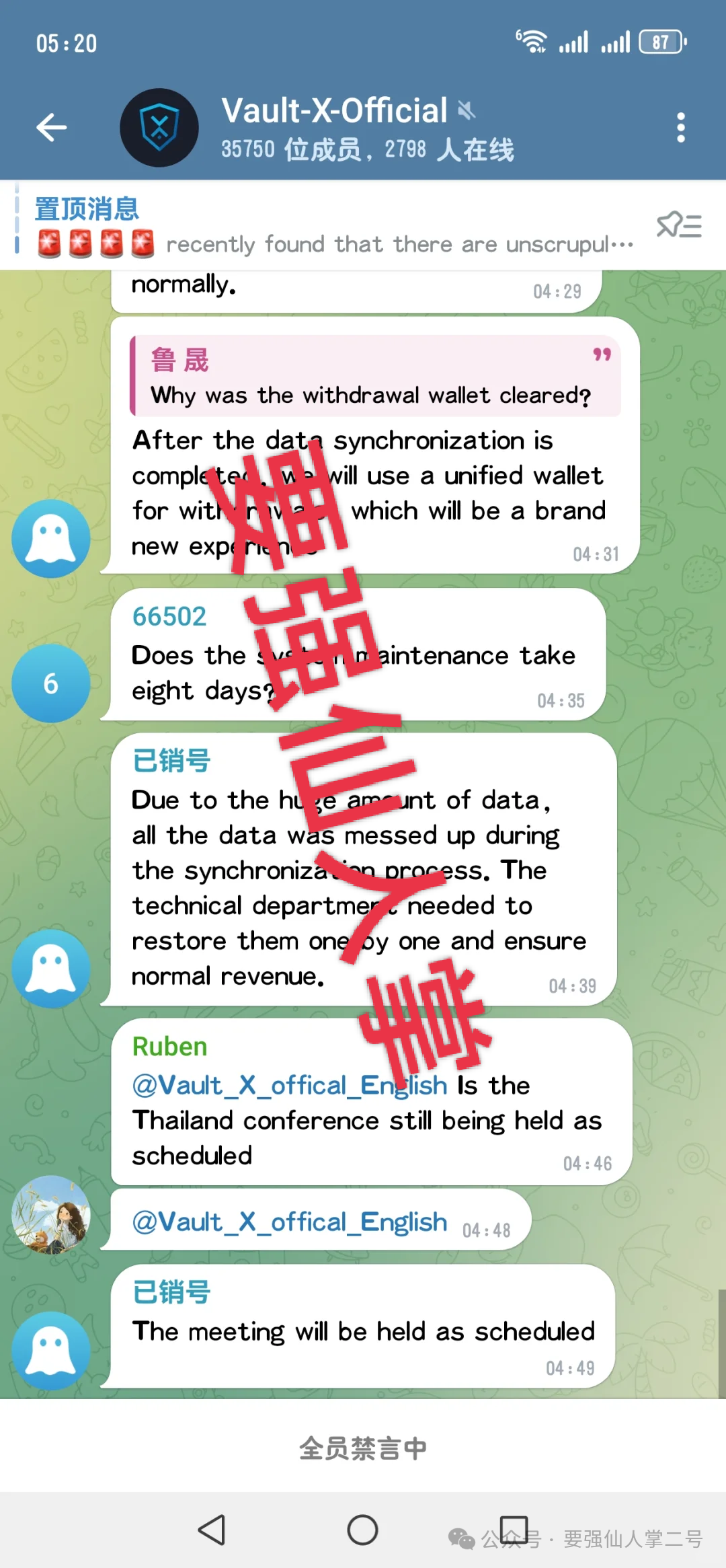 在来看看群里的托,账号全部注销,全员禁言,前面文章我就说过VAX前期利润设置过高,还存在复利增长模式,除非它从一开始就没打算长期运营,只想捞一笔就走,否则按照这种利润模式,根本维持不了多久,很快就会进行收割。