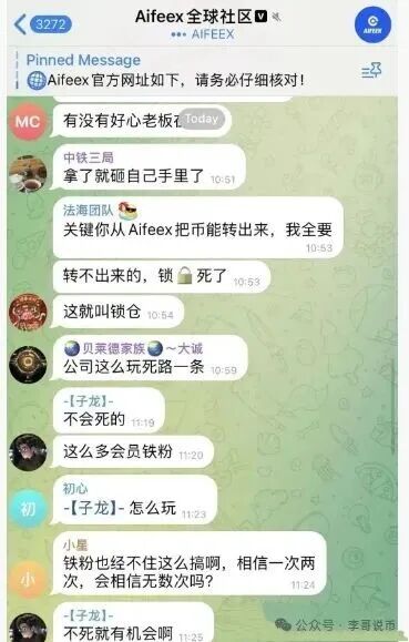 社群里面呢,管理员早就不上线了,但还是有一些人在那里鼓吹Aifeex有多好,让大家继续投钱。2025年5月的时候,就已经有提现通道堵塞的情况了,资金延迟超过30天还到不了账。客服就只会说老板出国了、系统升级中,这些都是资金盘跑路的老套路了。