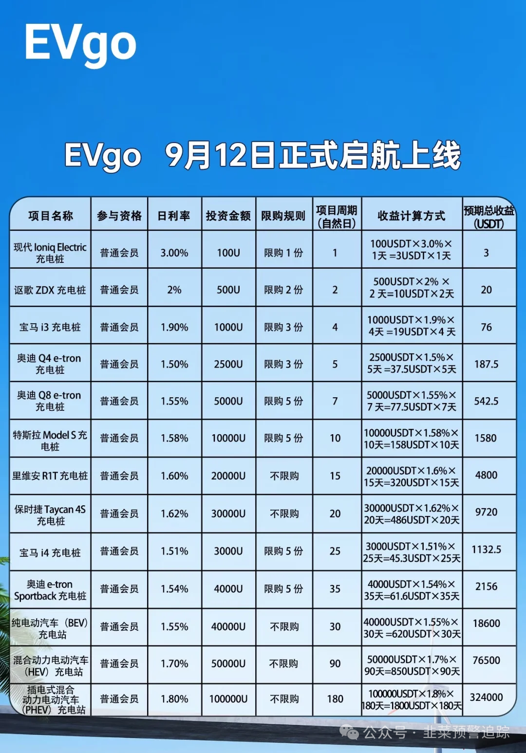 EVgo是新的短命盘骗局,与昆仑智脑等套路相同。它包装成充电桩投资项目,产品是假的,收益日化率1%-3.4%,远超行业正常水平。平台界面简陋有漏洞,由 繁星汇团队推动,和之前神酱团队类似,本质是专业骗子。参与这类项目会血本无归,大家要果断远离并提醒他人。