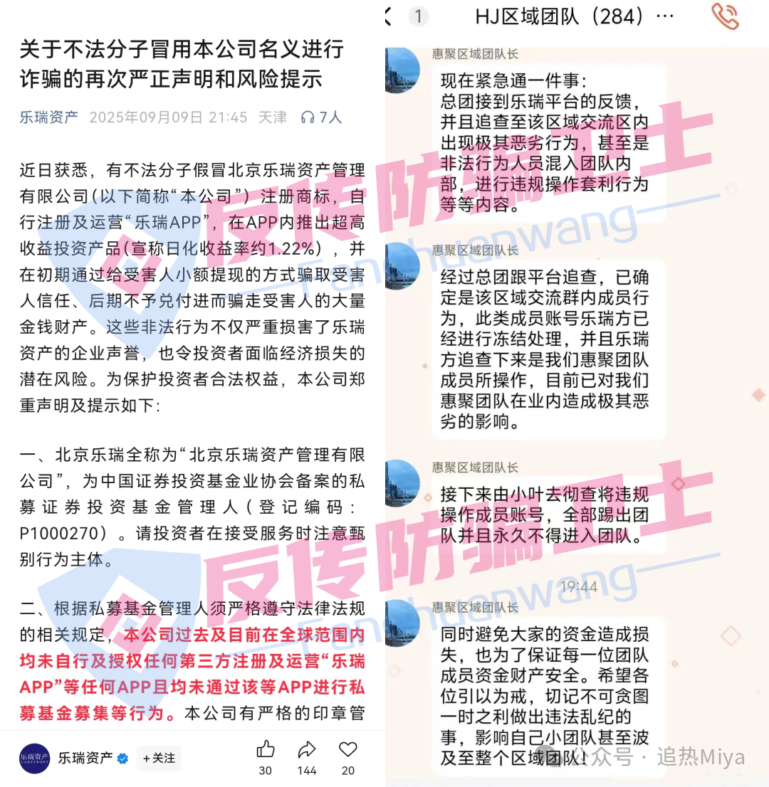 前期为骗取信任,平台会正常兑付小额收益,可一旦用户投入大额资金、产品到期申请提现时,平台便会突然 “翻脸”——APP 无法打开、客服消失、投资者聊天群被解散,彻底切断与用户的联系。此前正规 “乐瑞” 公司已多次发布澄清声明,强调与该 APP 无任何关联,而目前该诈骗平台已关网跑路,大量受害者正抱团维权,追回资金难度极大。