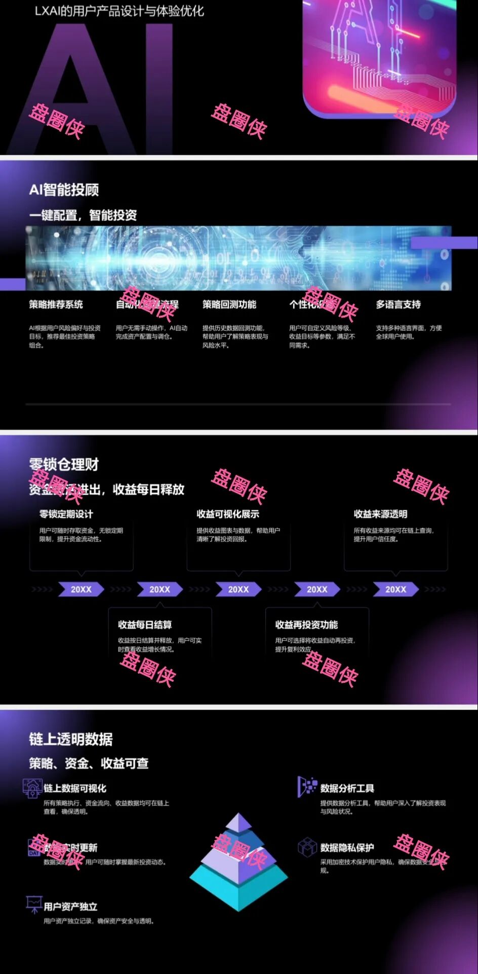 该盘宣传LXAI 是一家专注于加密货币市场的AI智能投资平台,致力于为用户提供高效、智能、稳定的数字资产交易体验,用AI驱动的智能平台,毫秒响应、精准交捕捉每一次加密资产机会,无需手动操作,系统每日自动结算并滚入本金,资金灵活自由,随进随出,享3代收益,1代20%,2代5%,3代1%。