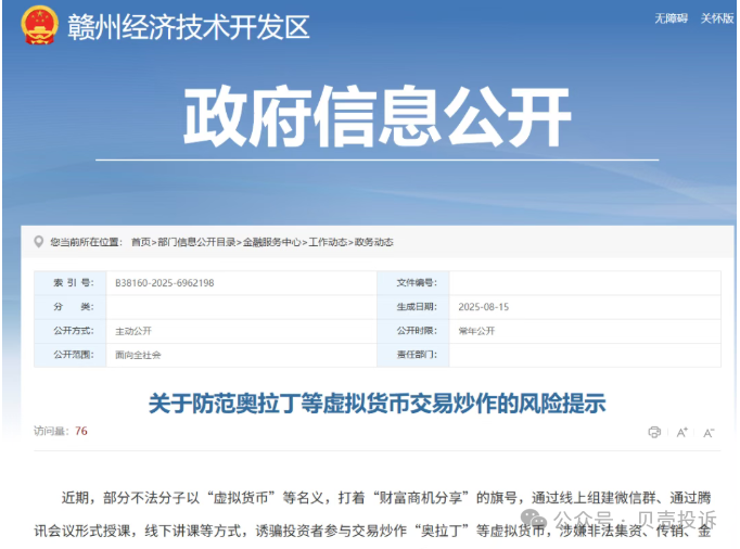 1、2025 年 8 月至 9 月,江西官方媒体 “欧潭融媒” 及赣州经济技术开发区管委会接连发布风险提示,直指 “奥拉丁”(Origin)虚拟货币项目涉嫌非法集资、传销和金融诈骗。