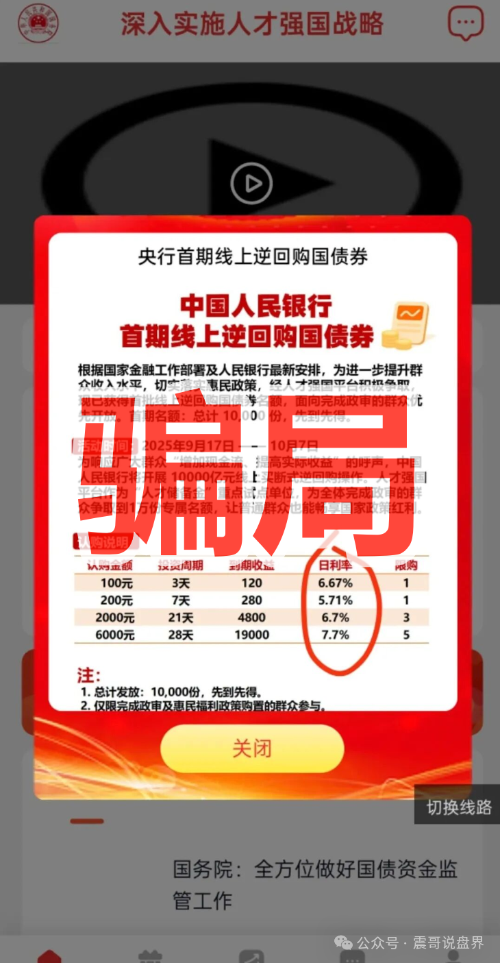 最近有个叫"人才强国"的资金盘特别猖狂,打着中国人民银行的旗号到处骗人。震哥今天必须给大家扒一扒这个骗局,免得有人上当。这帮骗子是真敢编啊!说什么央行回购、政审名额,全是扯淡。...