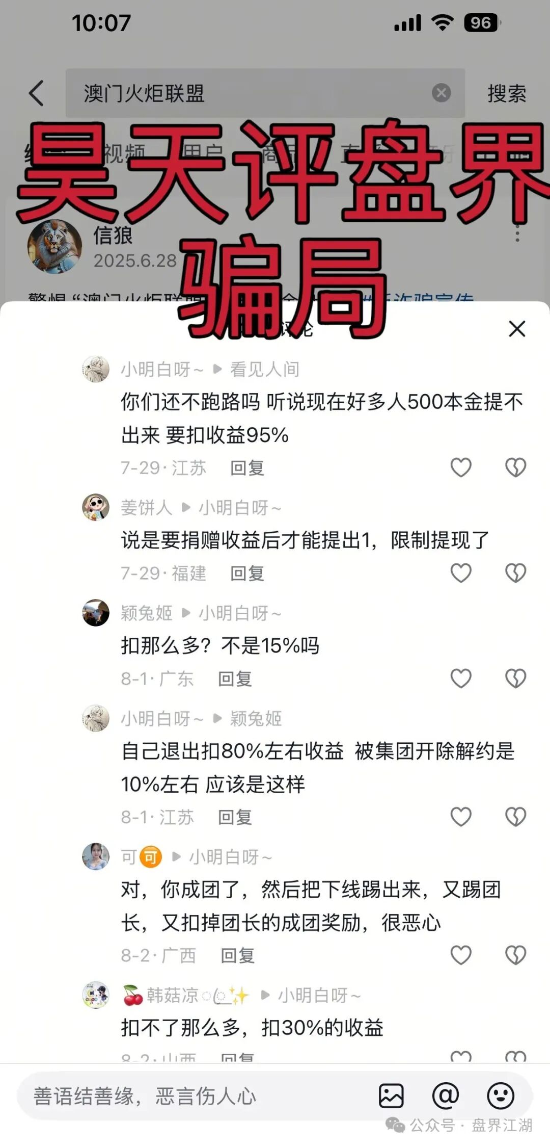 昊天评盘界:澳门辉煌火炬联盟合约跟单类资金盘骗局,之前昊天预警过2次,相信看过昊天文章的粉丝都已经安全撤离了,据受害者爆料目前11万会员,操盘手李逸川圈钱过亿,大量单割会员,高...