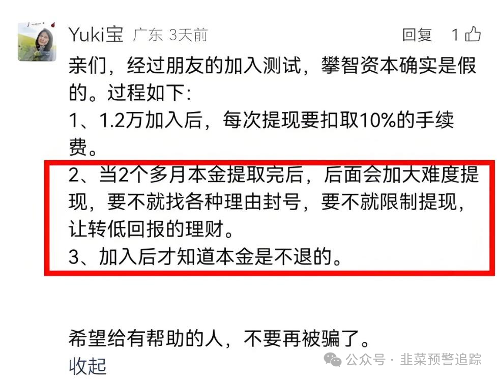 警惕攀智资本(西北资管)资金盘骗局!它打着资管旗号,行庞氏骗局之实,投钱后不拉人就被单割,群里晒收益多是托。项目方操作明目张胆,跑路前兆明显,受害者发声被屏蔽。高回报、拉人头项目多是陷阱,大家千万别参与,若已入局要立刻止损、保存证据、果断报警,别让血汗钱成他人跑路盘缠。