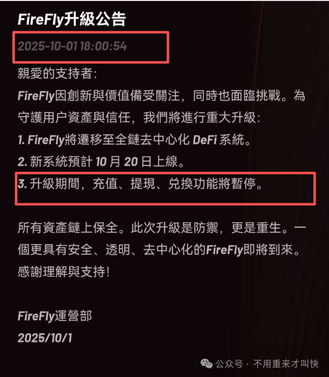 突发暴雷,无法提现!萤火协议FireFly疑似跑路!公告暂停提现20天!
