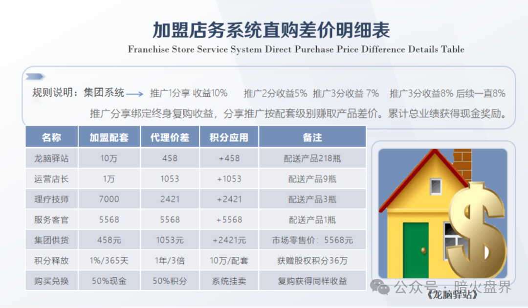 而这个模式设计的巧妙之处在于最高级别“龙脑驿站”的设计上,加入这个级别需要向公司转10万元代理费,公司会给200多瓶产品。五个级别当中只有“龙脑驿站”需要直接向公司转账加入,公司只直接控制这一个最高级别,赚这一份钱,其余的钱都分给了下面的代理。看似是这样的模式,但是又设计了股权积分报单的限制,你想要更多的股权积分,那就要升级啊!最终还是要升级到“龙脑驿站”这个级别。推广人员跟小诺说,全国只有3000个“龙脑驿站”的名额,加入满了之后,公司就不要了。其实这种说辞也就忽悠一下老年人,公司有多少驿站级别的代理,只有公司自己知道,你们又看不到后台数据,当然随便说了!再有3000*10万=3亿,一个产品盘毛收到了三个亿,还不收手等什么呢?这还不算购买消费积分的钱呢!另外说什么股权积分等公司上市可以换股票。这种说法简直就是侮辱智商,这么多年各种盘子都说自己能上市,哪个公司上市了呢?唯独上市那两个都是锁仓,谁变现了?